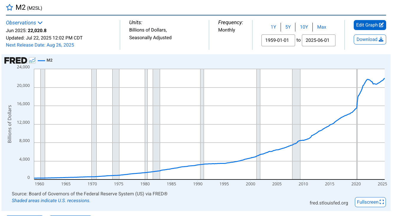 As of June, the M2 money supply stood at $22 trillion and is above the peak reached during the pandemic.