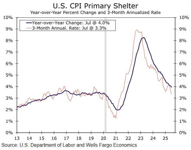 For all the consternation over the impact of tariffs on goods prices, it was mostly service-related categories that accounted for the firmer core reading in July. Medical care services (+0.8%) and airfares (+4.0%) posted monthly readings that were stronger than we were expecting and above their recent trends. Rent of primary shelter and owners' equivalent rents were spot on, matching expectations at 0.3% month-over-month. Primary shelter inflation continues to moderate on trend and is starting to approach its pre-pandemic pace (chart). Core goods inflation was 0.2%, below the 0.3% we were expecting but above the 0.05% that this category averaged in the 12 months ending in June. Tariff-related price increases continued to seep slowly into the data, with prices for household furnishings, apparel and recreational goods once again climbing higher. Prices for used autos rose 0.5% in the month, while new vehicle prices were roughly flat in July.