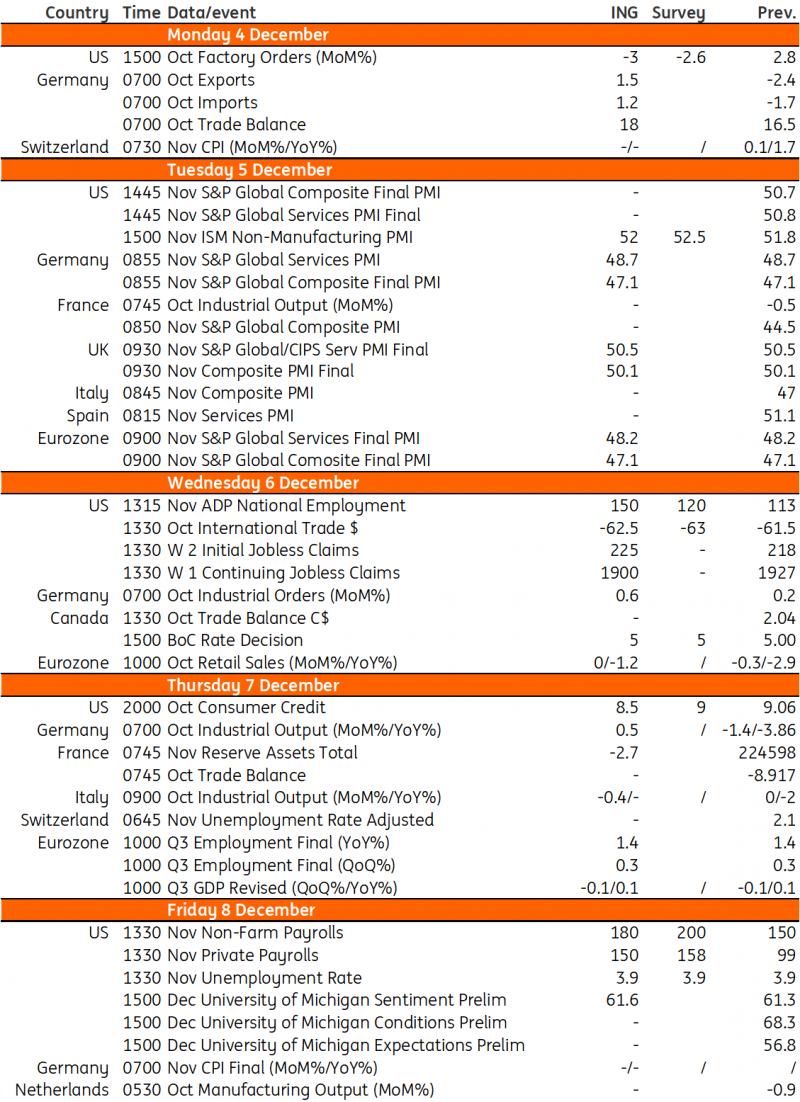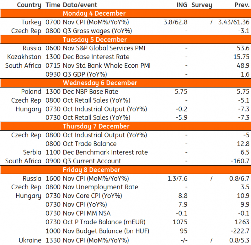 All eyes will be on the November jobs report in the US, with the trend expected to point towards weaker hiring. Over in Hungary, a busy week ahead sees the release of headline and core inflation numbers. We're expecting both to fall by around 2ppt.