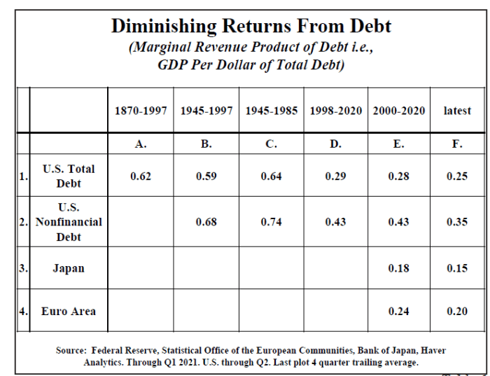 Excessive indebtedness acts as a tax on future growth and it is also consistent with Hyman Minsky’s concept of “Ponzi finance,” which is that the size and type of debt being added cannot generate a cash flow to repay principal and interest. While the debt has not resulted in the sustained instability in financial markets envisioned by Minsky, the slow reduction in economic growth and the standard of living is more insidious.