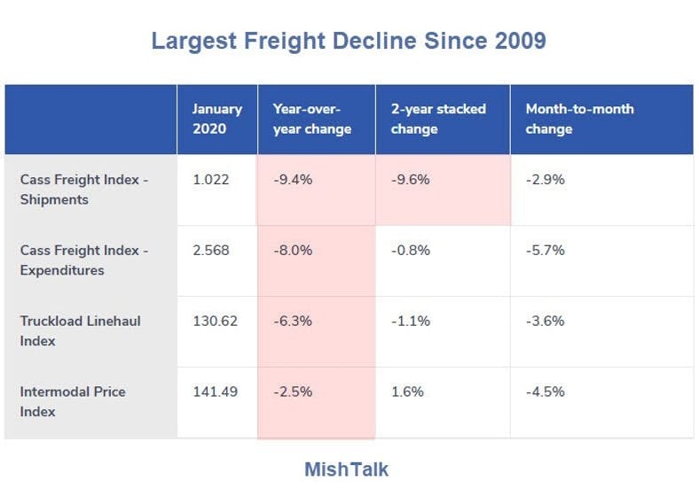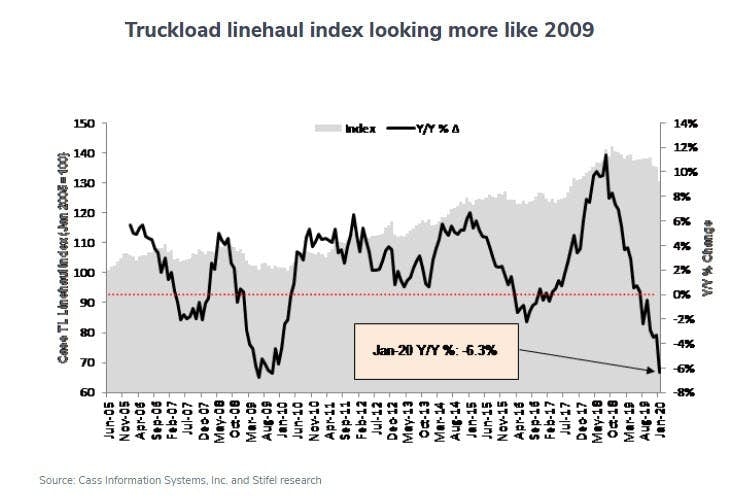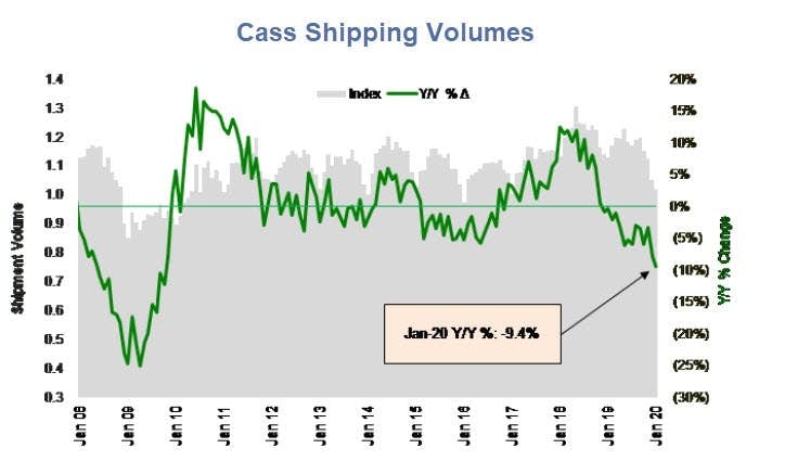 The Cass Freight Shipping Index is down 9.4% year-over-year, the largest decline since 2009. And this is for January, before the Coronavirus disruption.