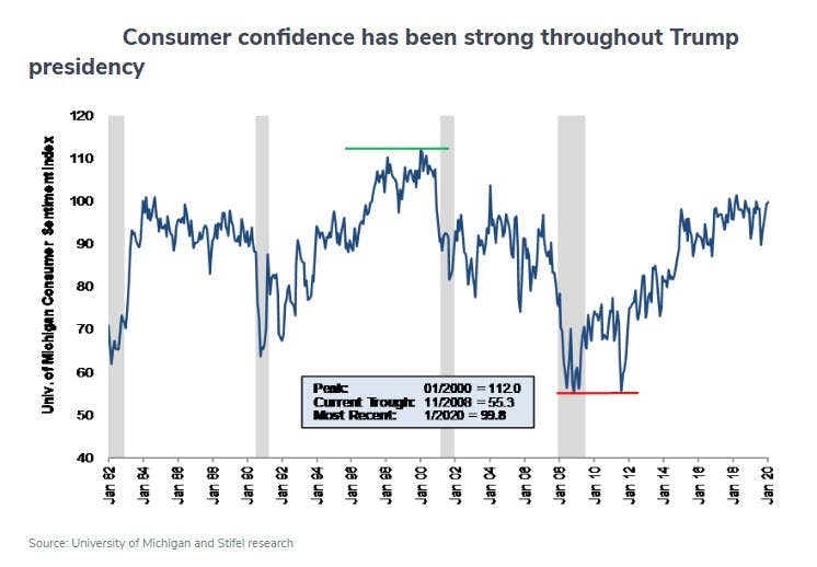 On the plus side, going into 2020, the sentiment index for consumer confidence remains high. This is why the freight (and industrial) data has not translated into worse news for the broader economy yet. If this trend continues, it will provide support for the economy and likely guarantee the President a second term in office.