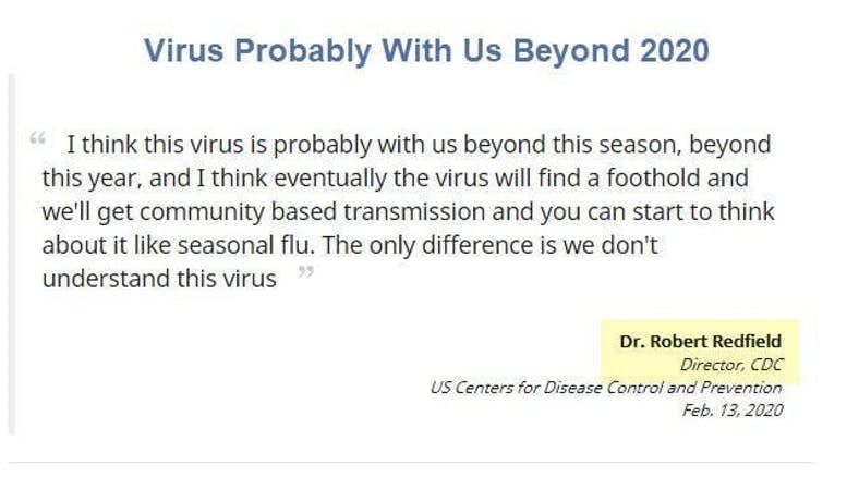 CDC director Dr. Robert Redfield says "I think this virus is probably with us beyond this season, beyond this year, and I think eventually the virus will find a foothold and we'll get community based transmission and you can start to think about it like seasonal flu. The only difference is we don't understand this virus."
