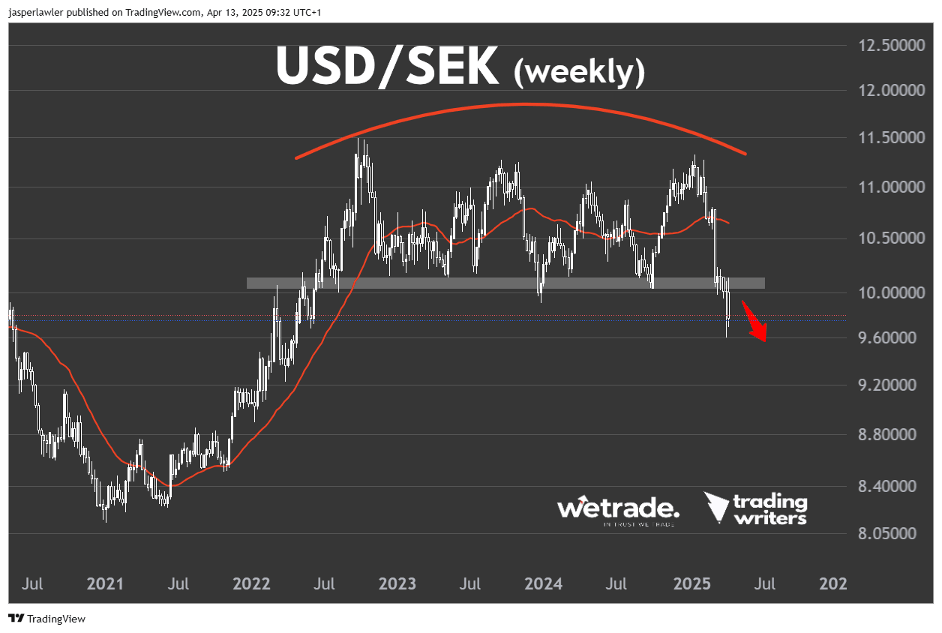 Zooming out to a monthly chart, we can see the price is testing its lowest levels since the de-pegging in 2015. The bearish engulfing pattern from the triangle top and 30-month moving average suggests a break lower.