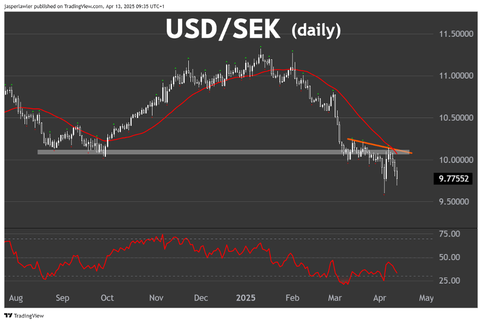 Momentum as shown by RSI is the weakest since August last year. Following the fakeout over 0.96 and subsequent drop, we think a break lower is imminent.