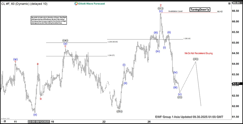 The short-term Elliott Wave structure in crude oil indicates a downward cycle from the June 23, 2025, high, unfolding as a five-wave impulse. Wave 1 concluded at $61.45, and wave 2 rallied to $66.42, as shown on the 1-hour chart. Wave 2 developed as a regular flat structure. From wave 1’s low, wave ((a)) peaked at $64.76. Wave ((b)) fell to $61.85, and wave ((c)) advanced to $66.42, finalizing wave 2.