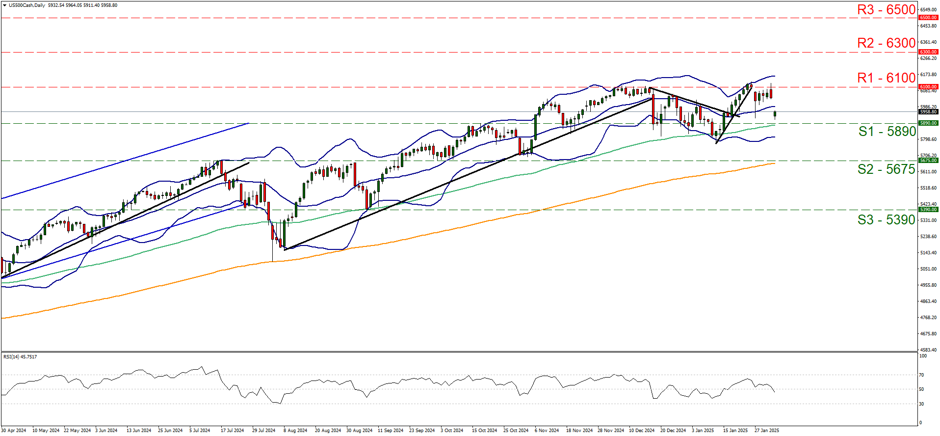 On a fundamental level, US equities may be influenced by the path of the US earnings season, which is in full swing this week, while the activation of the US tariffs on US imports from China, Canada and Mexico created a wide uncertainty among market participants which weighed on US equities. On a technical level, we note that S&P 500 hit once again a ceiling at the 6100 (R1) resistance line, on Friday, which by the way is a record high level for the index. We tend to maintain our bias for a sideways motion of the index’s price action. A direction that has been followed by the index since the 16th of December last year, when the strong upward trendline was broken. Also the RSI indicator dropped slightly below the reading of fifty, yet remaining unconvincing for now. For a renewal of the bullish outlook of the index, we would require the index’s price action has to enter unchartered waters, breaking the 6100 (R1) resistance line and we set as the next possible target for the bulls the 6300 (R2) resistance level. On the flip side, should the bears take over, we may see the pair falling, breaking the 5890 (S1) support line which and actively aim for the 5675 (S2) support level, while even lower we note the 5390 (S3) support hurdle.
