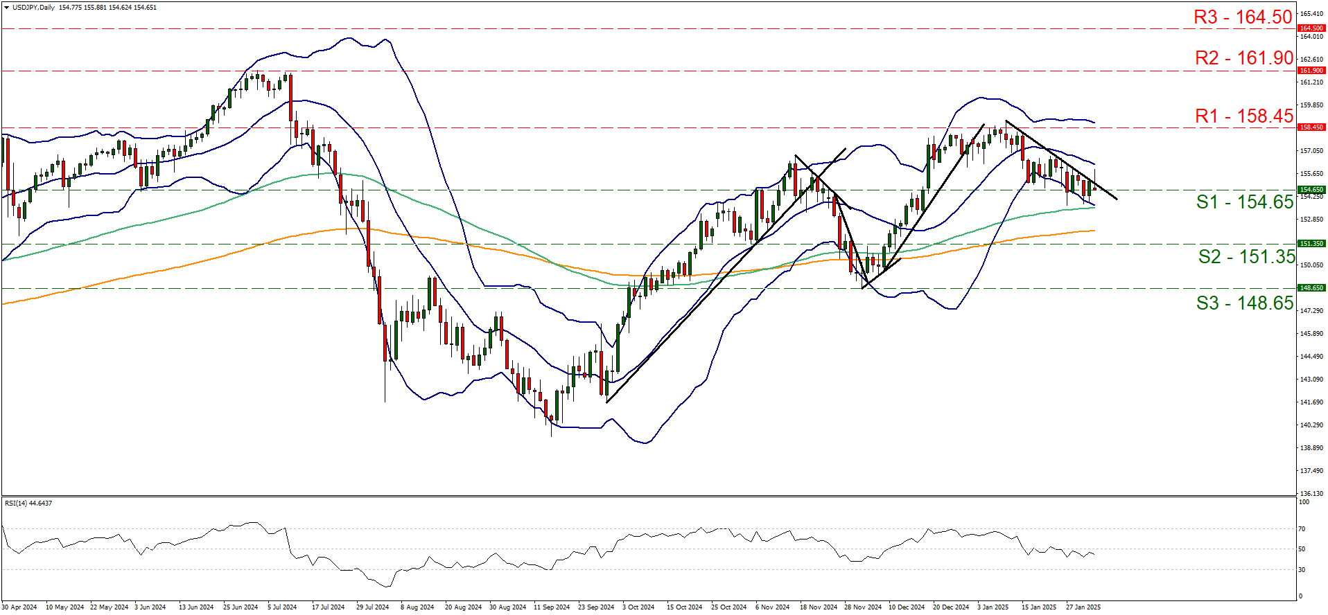 On a fundamental level the hawkish intentions of BoJ, with the bank seeing scope for more rate hikes after the January meeting may be supporting the Yen. Please note that given the wide uncertainty in the markets, the Japanese currency may also be enjoying some safe haven inflows. On a technical level, USD/JPY has been struggling to break the 154.65 (S1) support line over the past three days. We tend to maintain a bearish outlook for the pair as long as the downward trendline guiding the pair since the 10th of January, at which date it formed its latest peak, remains intact. Also the RSI remains just below the reading of 50, which could imply a slight bearish predisposition on behalf of the market for the pair. Should the bears maintain control over the pair, we may see it breaking the 154.65 (S1) support line clearly, possibly using the S1 as a resistance line and continue lower to aim for the 151.35 (S2) support level. On the flip side, should the bulls take over, we may see the pair reversing course, breaking the prementioned downward trendline in a first signal that the downward motion has been interrupted and continue higher to actively aim if not breach the 158.45 (R1) resistance level, with the next possible target for USD/JPY bulls being the 161.90 (R2) resistance level.