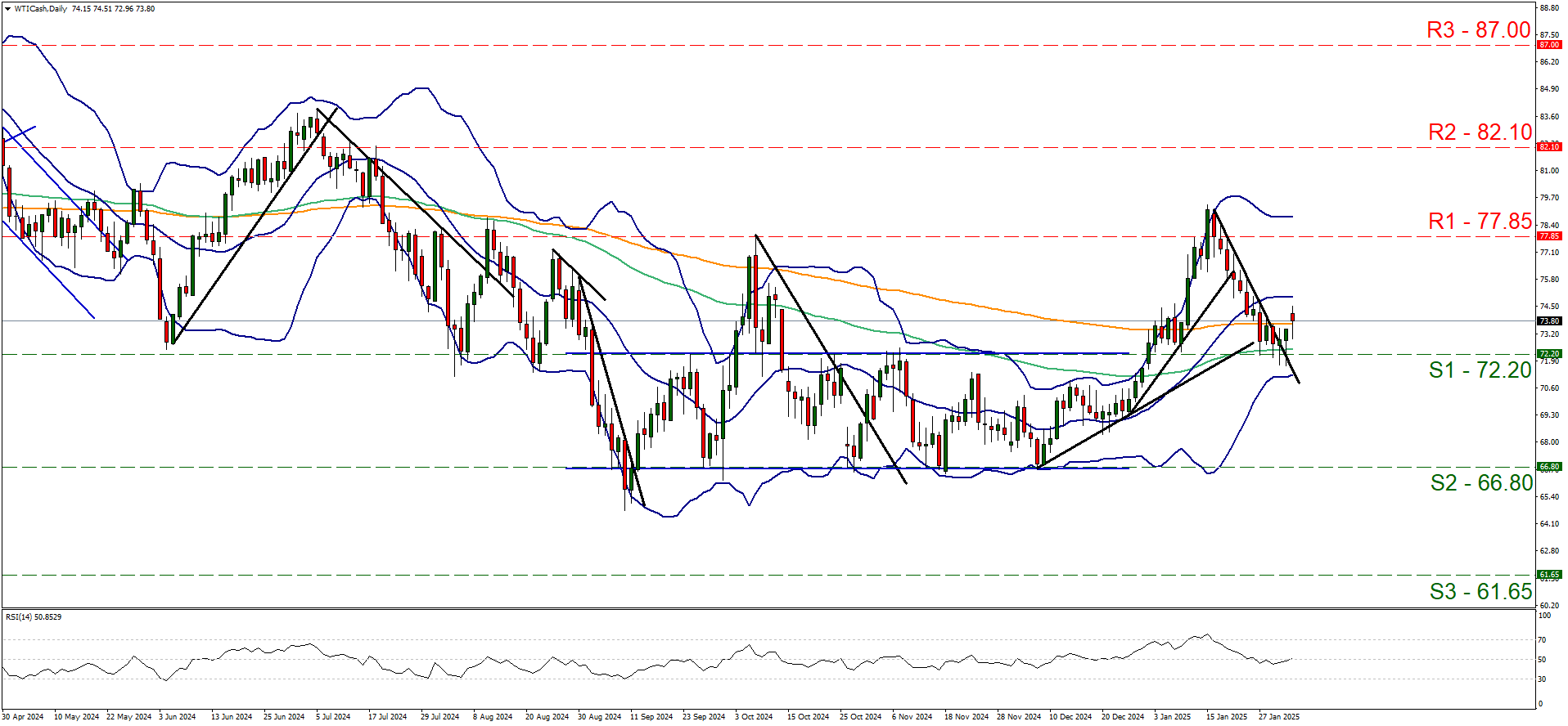 Oil prices jumped in today’s Asian session, as the market worries for the US tariffs to cause a disruption in oil supply heightened. We also note that the OPEC meeting is to take place today and should the oil producing cartel, decide to slow down the recovery of oil production levels or even decide to keep them low, we may see the decision having a bullish effect on oil prices. On a technical level, we note that the on Friday the price action of oil bounced on the 72.20 (S1) support line breaking the downward trendline signaling an interruption of the downward movement. The RSI indicator corrected higher yet failed to clearly break above the reading of 50 clearly, in a signal that the market may still be indecisive. Hence we maintain for the time being a bias for a sideways motion of the commodity’s price. For a bullish outlook we would require the commodity’s price to break the 77.85 (R1) resistance line and start aiming for the 82.10 (R2) resistance base. On the flip side should the bears retake the initiative over the direction of WTI’s price action, we may see it breaking the 72.20 (S1) support line clearly and start aiming for the 66.80 (S2) support level.