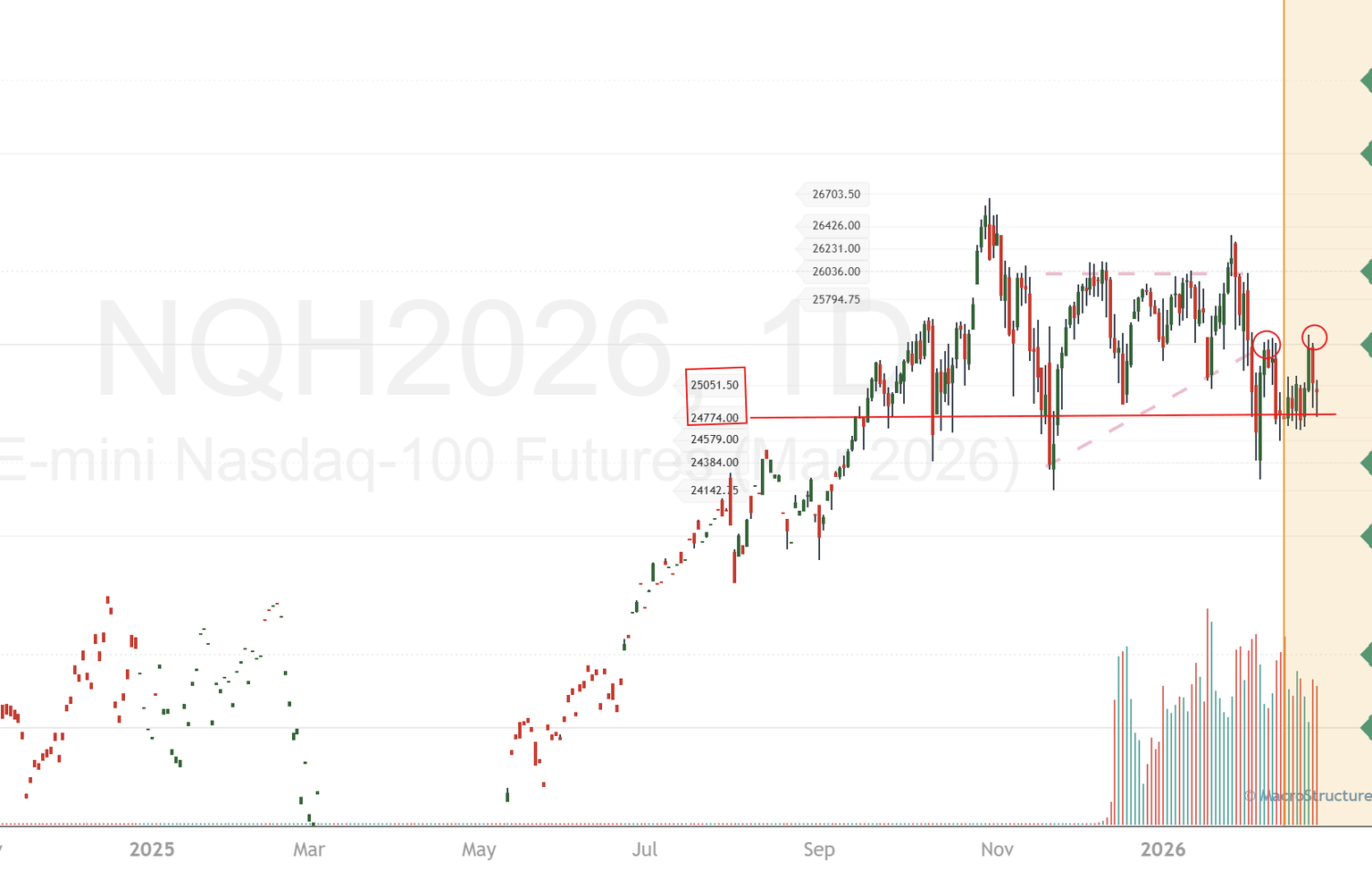 Nasdaq March futures (MNQ) started the week below the daily central pivot (25405), trading from the lower gate zone at 25051–24774 and continuing the same defensive posture from the prior week. The lower gate held early, preventing further deterioration in structure.