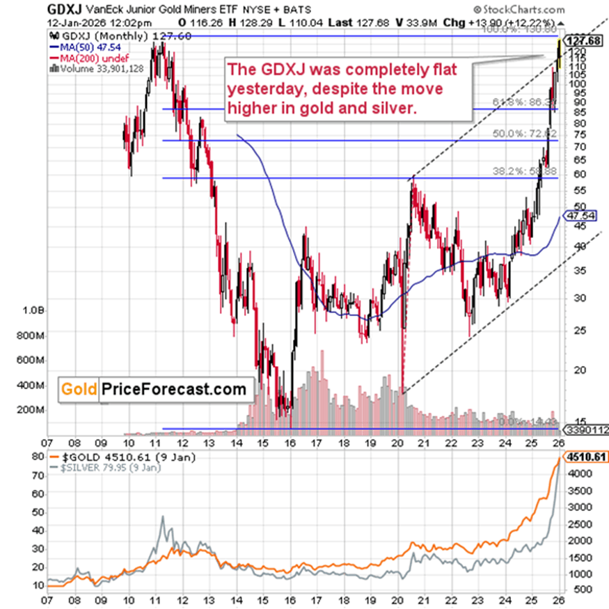 Namely, the GDXJ is about to reach its all-time high. If someone bought close to the 2011 top, they are only even right now – in nominal terms. In real terms, they will need to wait much longer to get even.