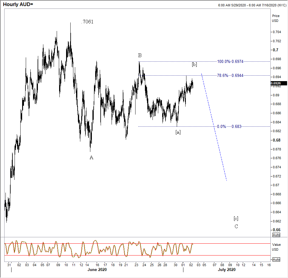 AUD/USD Hourly: Acting relatively weak here despite stocks. Would be our favorite short if a dollar reversal (risk off) is seen over the next few days or less.