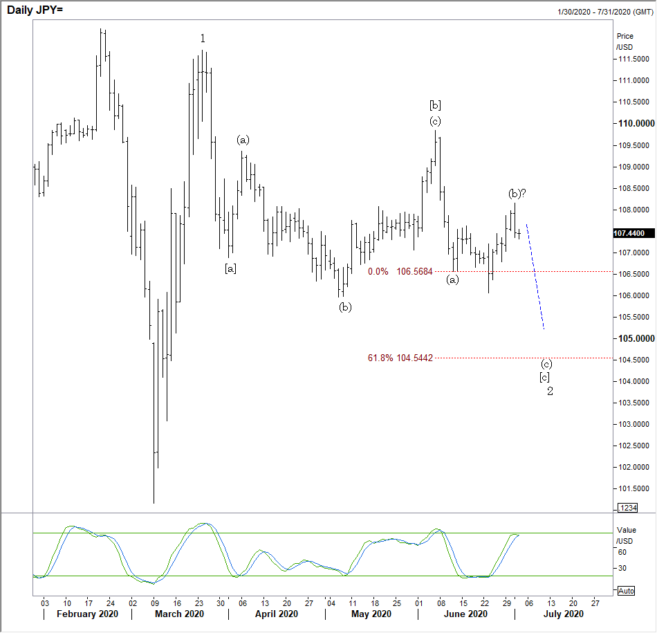 USD/JPY Hourly: A minor push higher in Wave (ii), then lower. Now into 61.8% support near-term.