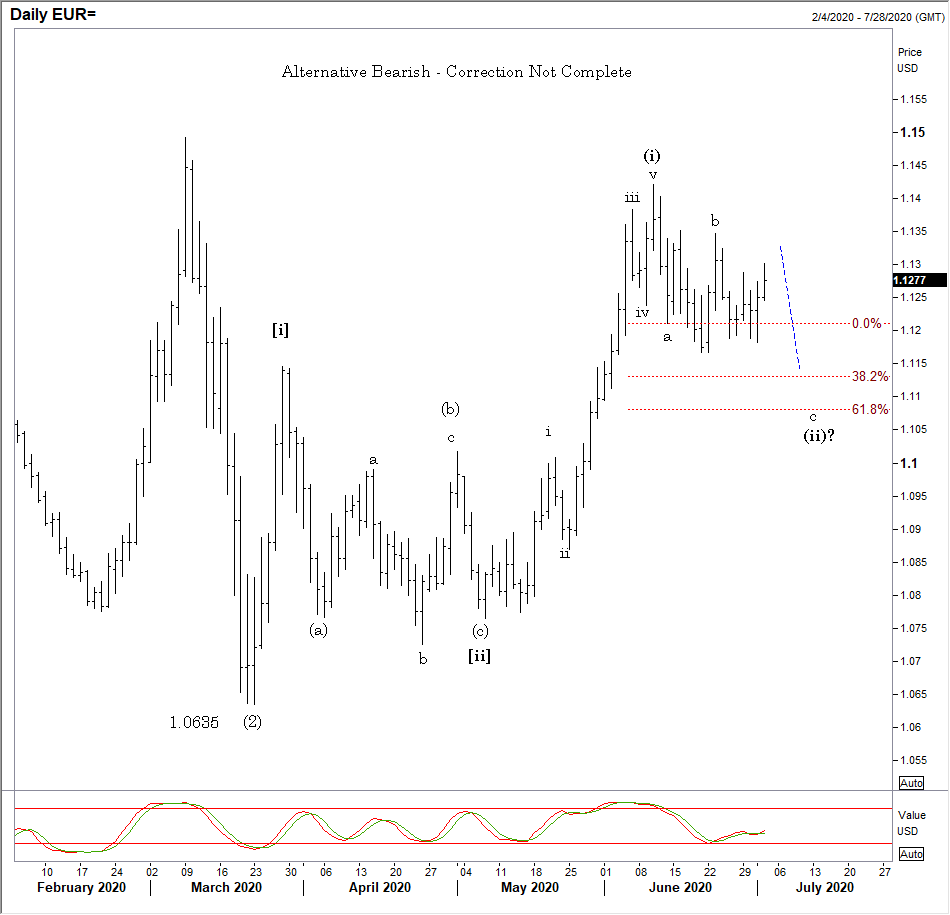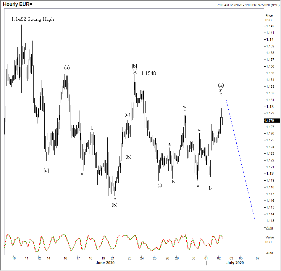 EUR/USD Hourly: A complex correction…the choppy moves here suggest more to go on the downside to complete a zig zag correction toward 1.1100. A bit higher first on stocks?