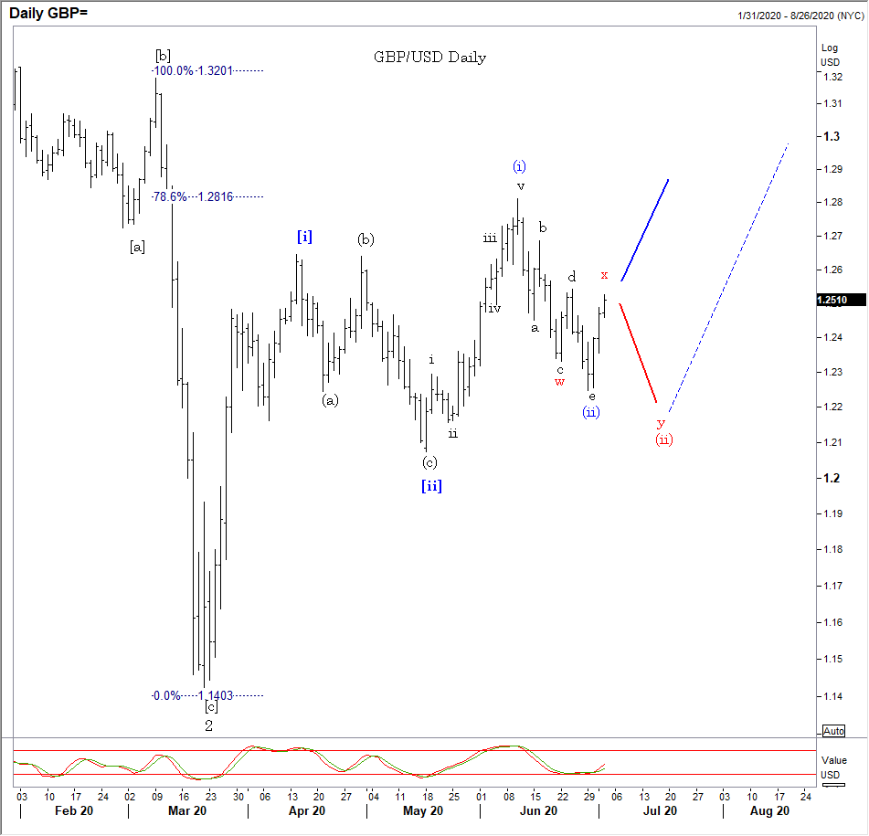 GBP/USD Hourly: In the midst of a 5-wave (c) to complete [x] before lower? Above 1.2687 adds weight to the “bottom is in” view at 1.2249. A push to 1.2570-1.2600 first?