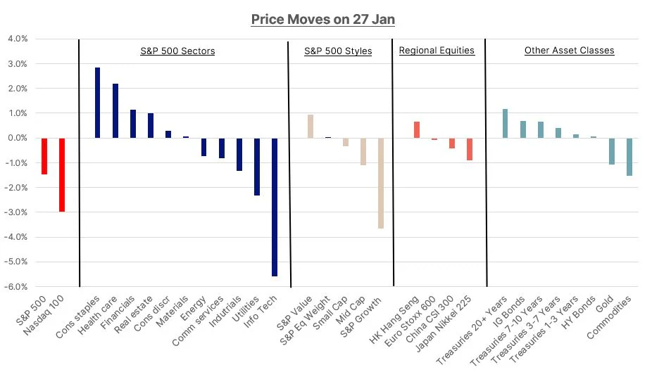 US tech was in the crosshairs on January 27, with the Nasdaq plunging and information technology stocks in the S&P 500 tumbling 5.6%. The trigger came from concerns over China’s deepening AI ambitions with its DeepSeek app providing a less expensive open-source alternative to OpenAI, which posed a potential challenge to US tech dominance. This spilled over into the broader S&P 500, which slid 1.5%, while growth-focused plays like S&P Growth index (-3.6%) were also hit hard.