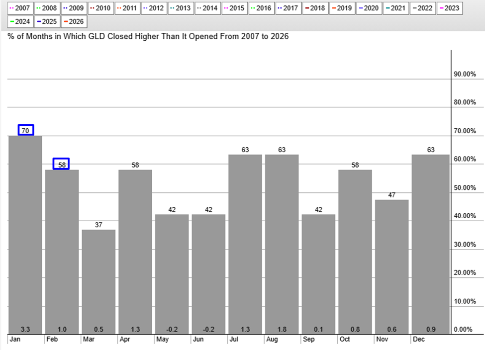 Since 2007, GLD has risen an average of 3.3% in January 70% of the time, and 1.00% in February 58% of the time.