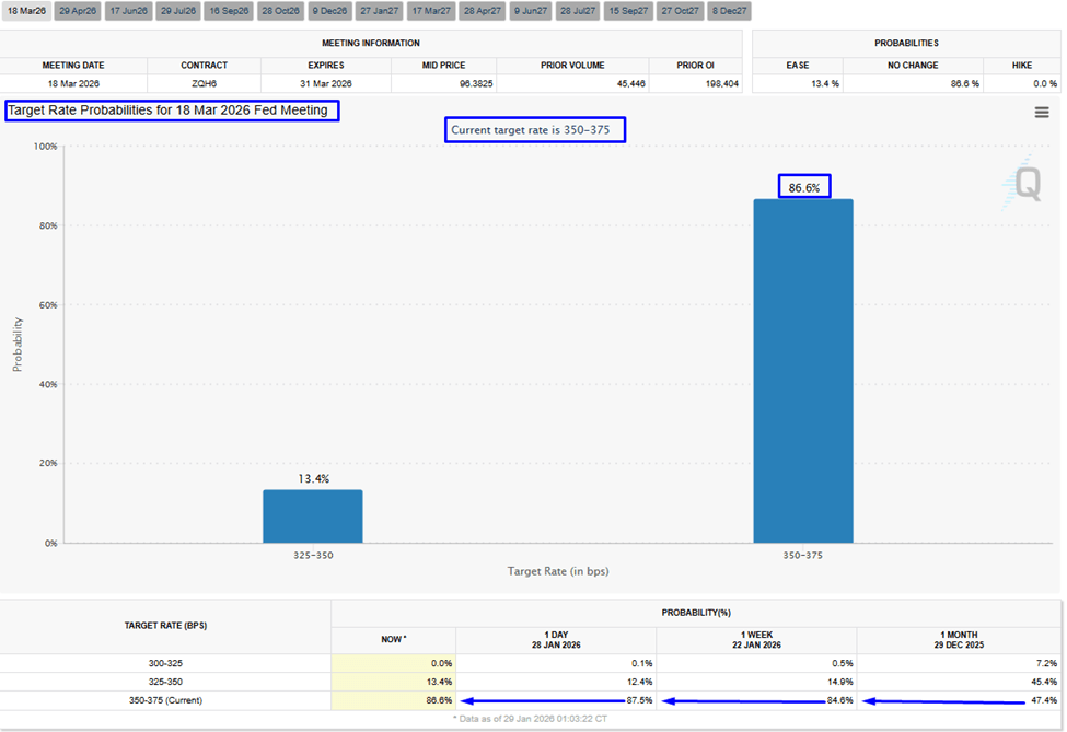 · CME FedWatch March no rate change probabilities have moved higher to 86.60% today from 47.4% on December 29, 2025.