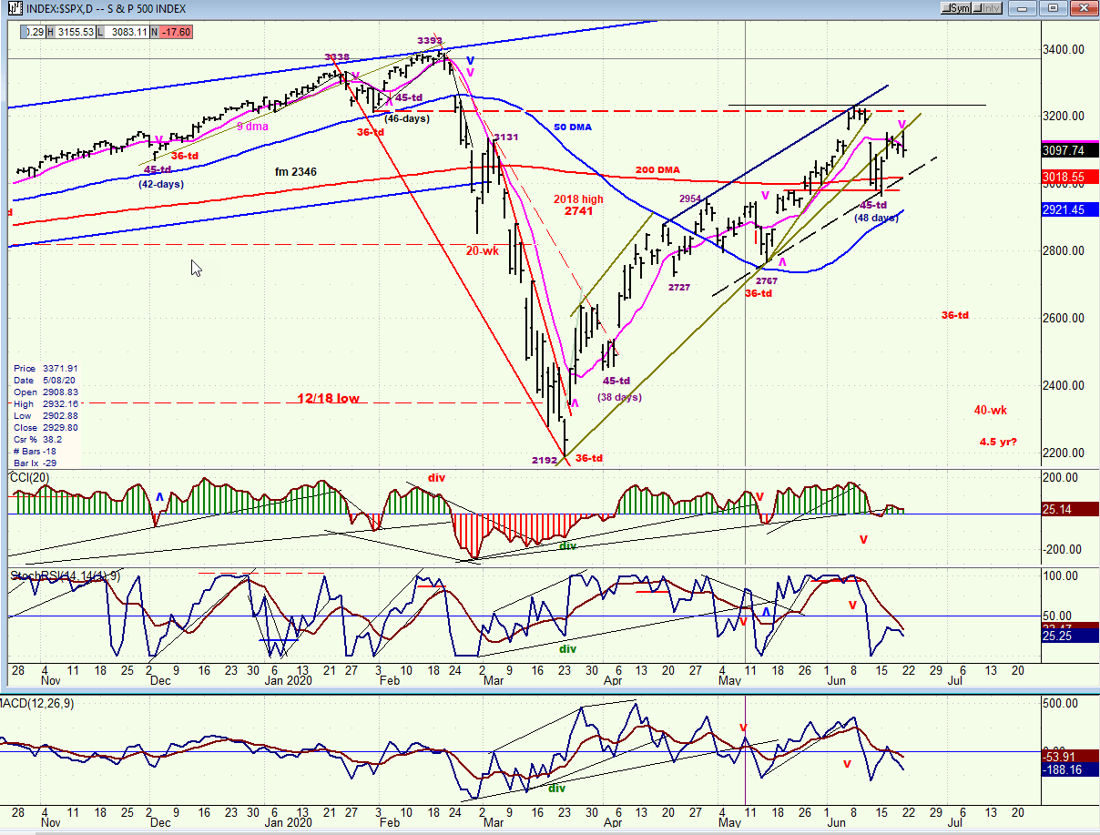 This looks as if heavy selling was met at the top of the range and it should be a prelude to additional selling over the near-term, especially since the futures sold off sharply after the close. In other words, a secondary high has been made since 3233 and the cycles shown on the chart are beginning to pull prices lower into the intermediate low which is expected in the middle of July.