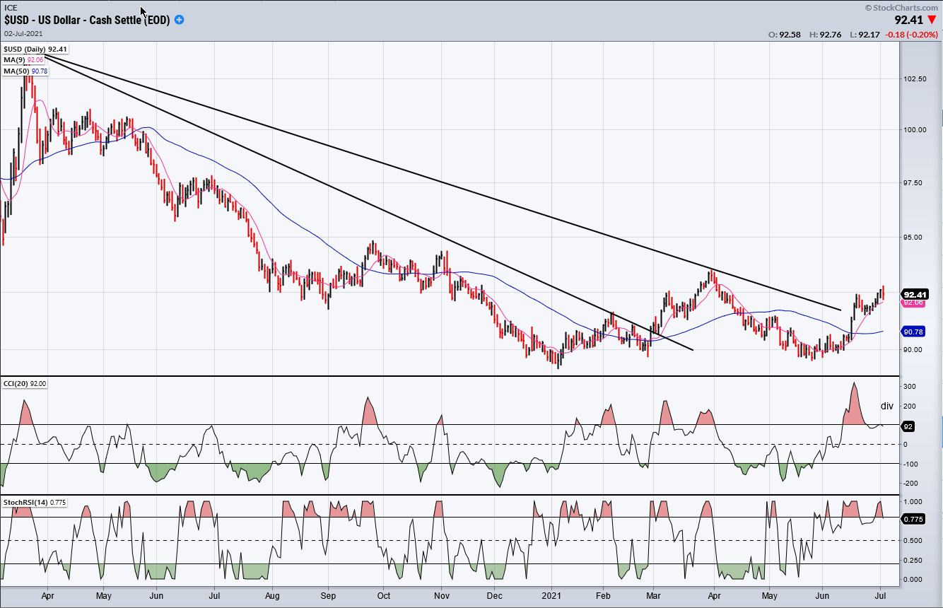 The dollar has bounced twice off its base but may have already reached the top of its second rally. Divergence has developed in the indicators which could lead to a pull-back. If this occurs, it could benefit gold and silver.