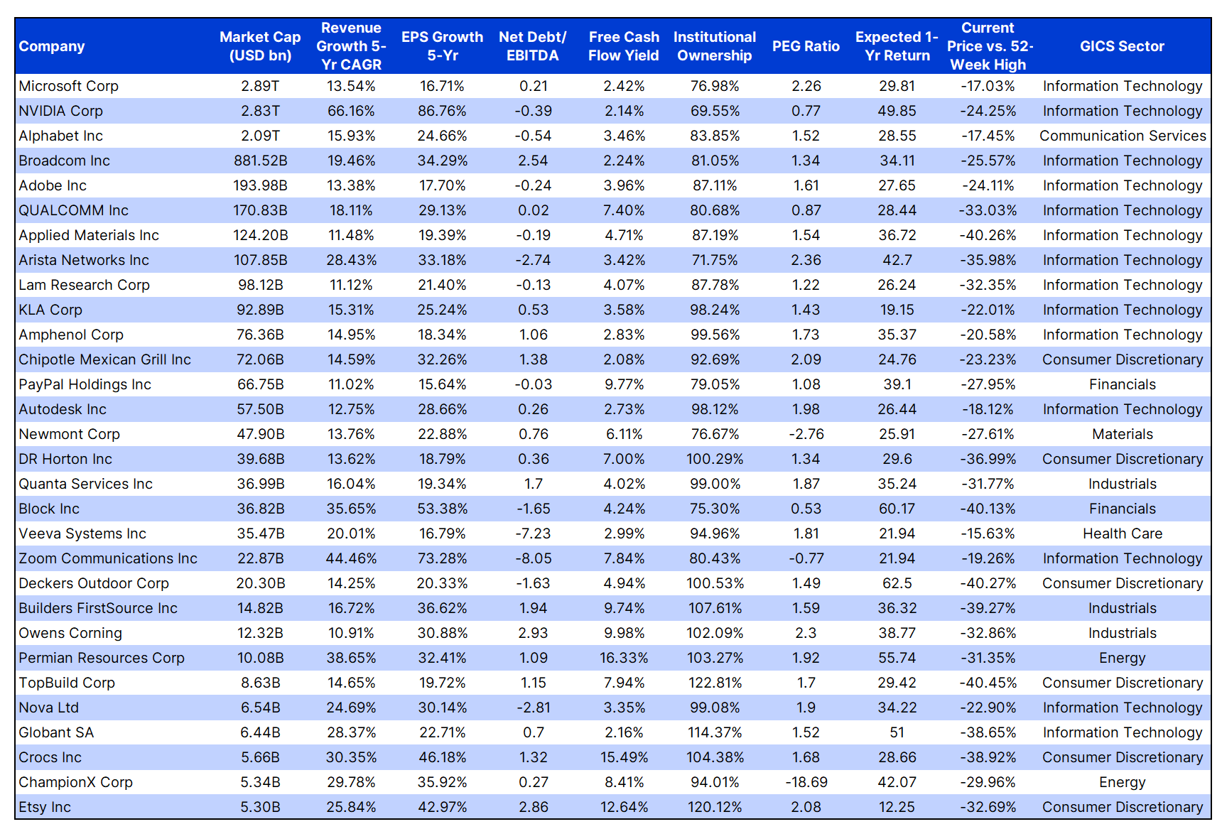 With that approach in mind, we used a structured screening process to identify growth stocks that balance strong fundamentals, reasonable valuations, and institutional support.