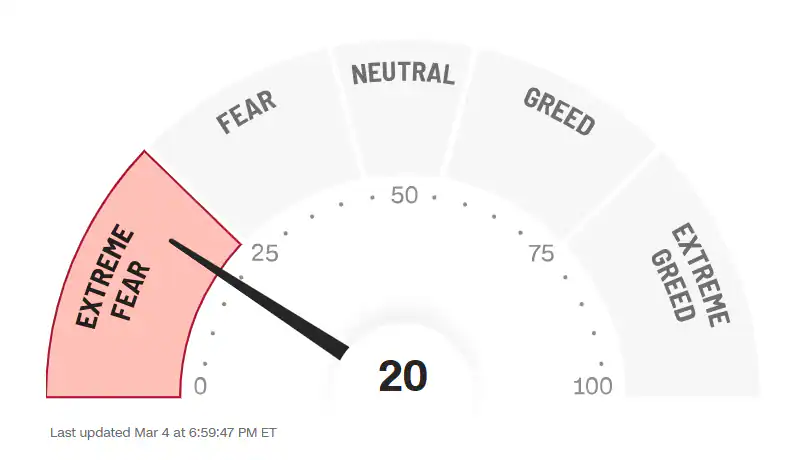 These factors have fueled volatility, leading to a sell-off in stocks. Fear is gripping financial markets, as can be seen from CNN’s Fear and Greed Index below. After dipping to 22 at the end of February, the index had fallen to 20 as of March 4, reflecting deep unease among traders and institutional investors alike.