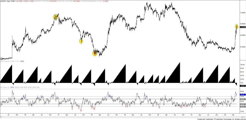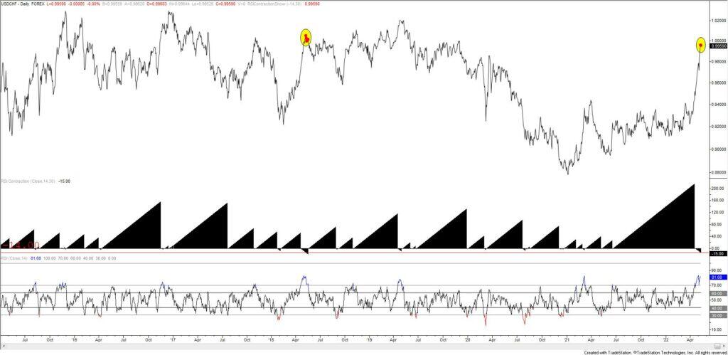 The strange looking indicator below price is the number of days that RSI has been either between 30 and 70 (a positive result) or the number of days that RSI has been below 30 OR above 70 (a negative result). The current reading for USDCHF is -14, meaning that RSI has been above 70 for 14 consecutive days. Previous instances of a reading this high resulted in reversals (see below as well).