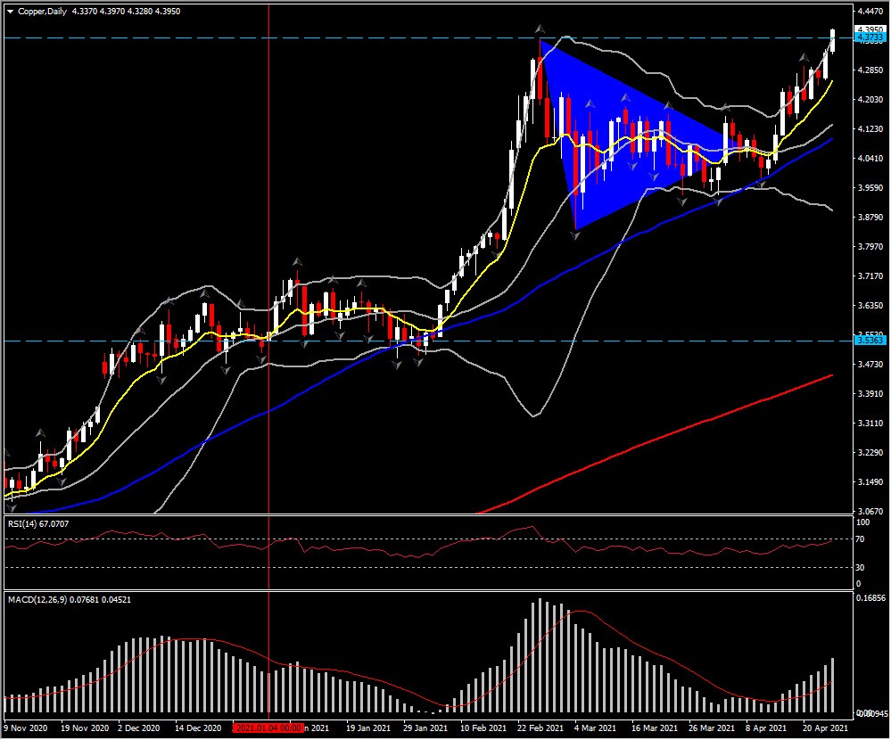 Biggest (FX) Mover @ (07:30 GMT) – Copper hits 10-year high on supply concern, easing USD. In the 1-hour chart, momentum is rising higher with fast MAs aligned higher, while RSI is at 82 with MACD extending northwards again. The USD is lower amid speculation Fed Powell will shun talk of tapering bond purchases at a policy meeting this week, making greenback-priced metals cheaper to holders of other currencies.