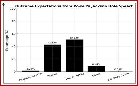 Markets are acting as though Jackson Hole is the end-all and be-all of financial indicators, specifically what Mr. Powell says. Expert commentator Donnelly held a poll of some 450+ of his readers and got the outcome on this chart—well over 80% think he will be neutral to hawkish while less than 10% see a dovish slant.