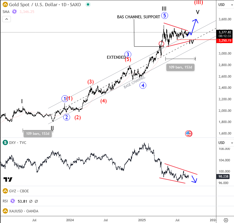 Gold holding up well, despite some rally on DXY in last 24 hrs, and if Dollar finds new sellers, metals will likely remain strong. In either case, bulls should eventually resume higher into wave five, especially since the larger time frame structure still indicates an incomplete impulse. If we see a daily or weekly close outside of this contracting range, then a breakout toward 3600 or even higher could follow.