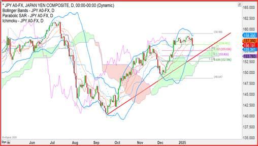 Where the breakout looks plenty real is the dollar/yen, as the market is buying into the BoJ raising rates next week (Jan 24). The dollar has fallen below the 20-day and broke the B band bottom, among other signals. The resistance line lies at about 153.18 today. Don’t laugh—it may be old-timey but is often applies as though by magic. It’s also not that far from the 50% retracement line.