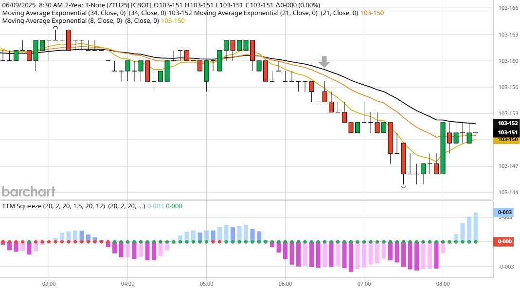 Yesterday the ZT slide Lower at around 7:30 AM EST with no economic news pending. The Dow climbed Higher at the same time. Look at the charts below and you'll see a pattern for both assets. The Dow moved Higher at 7:30 AM EST and the ZT slide Lower at around the same time. These charts represent the newest version of Bar Charts, and I've changed the timeframe to a 15-minute chart to display better. This represented a Short opportunity on the 2-year note, as a trader you could have netted about a dozen ticks per contract on this trade. Each tick is worth $6.25. Please note: the front month for ZT is now Sep '25 and the Dow is still Jun '25. I've changed the format to filled Candlesticks (not hollow) such that it may be more apparent and visible.