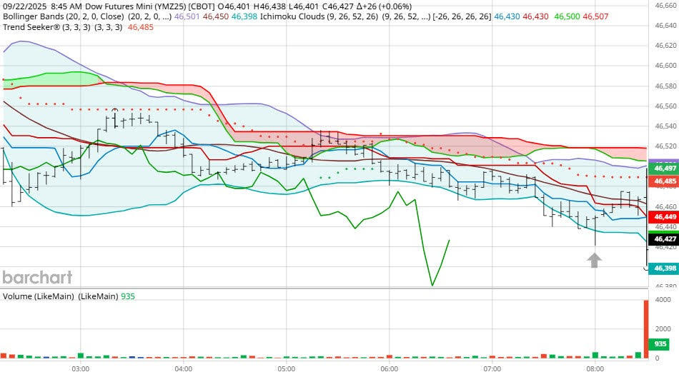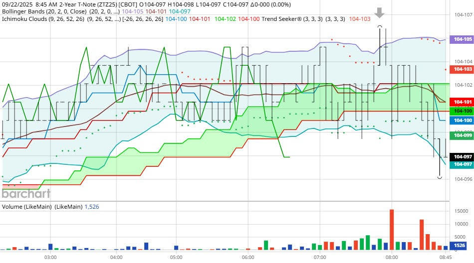 Yesterday the ZT dived Lower at around 8 AM EST with no real eco news items pending. The Dow climbed Higher at the same time. Look at the charts below and you'll see a pattern for both assets. The Dow climbed Higher at around 8 AM EST and the ZT dived Lower at around the same time. These charts represent the newest version of Bar Charts, and I've changed the timeframe to a 15-minute chart to display better. This represented a Short opportunity on the 2-year note, as a trader you could have netted about a dozen plus ticks per contract on this trade. Each tick is worth $6.25. Please note: the front month for ZT is now Dec '25 and the Dow is now Dec '25. I've changed the format to filled Candlesticks (not hollow) such that it may be more apparent and visible.