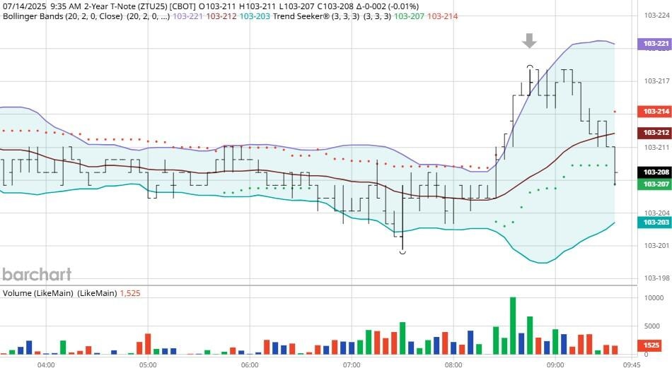 Yesterday the ZT dived Lower at around 9 AM EST with no eco news pending. The Dow leapt Higher at the same time. Look at the charts below and you'll see a pattern for both assets. The Dow climbed Higher at 9 AM EST and the ZT dived Lower at around the same time. These charts represent the newest version of Bar Charts, and I've changed the timeframe to a 15-minute chart to display better. This represented a Short opportunity on the 2-year note, as a trader you could have netted about a dozen ticks per contract on this trade. Each tick is worth $6.25. Please note: the front month for ZT is now Sep '25 and the Dow is now Sep '25. I've changed the format to filled Candlesticks (not hollow) such that it may be more apparent and visible.