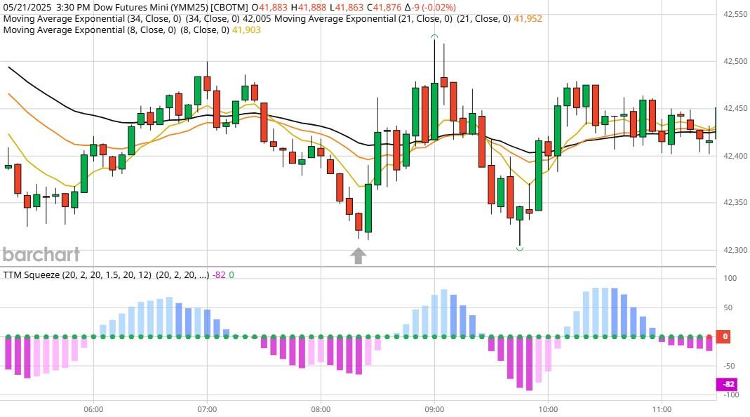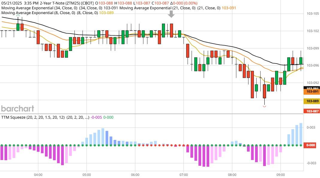 Yesterday the ZT dived Lower at around 8 AM EST with no news pending. The Dow climbed Higher at the same time. Look at the charts below and you'll see a pattern for both assets. The Dow moved Higher at 8 AM EST and the ZT dived Lower at around the same time. These charts represent the newest version of Bar Charts, and I've changed the timeframe to a 15-minute chart to display better. This represented a Short opportunity on the 2-year note, as a trader you could have netted a dozen plus ticks per contract on this trade. Each tick is worth $6.25. Please note: the front month for ZT is now Jun '25 and the Dow is Jun '25 as well. I've changed the format to filled Candlesticks (not hollow) such that it may be more apparent and visible.