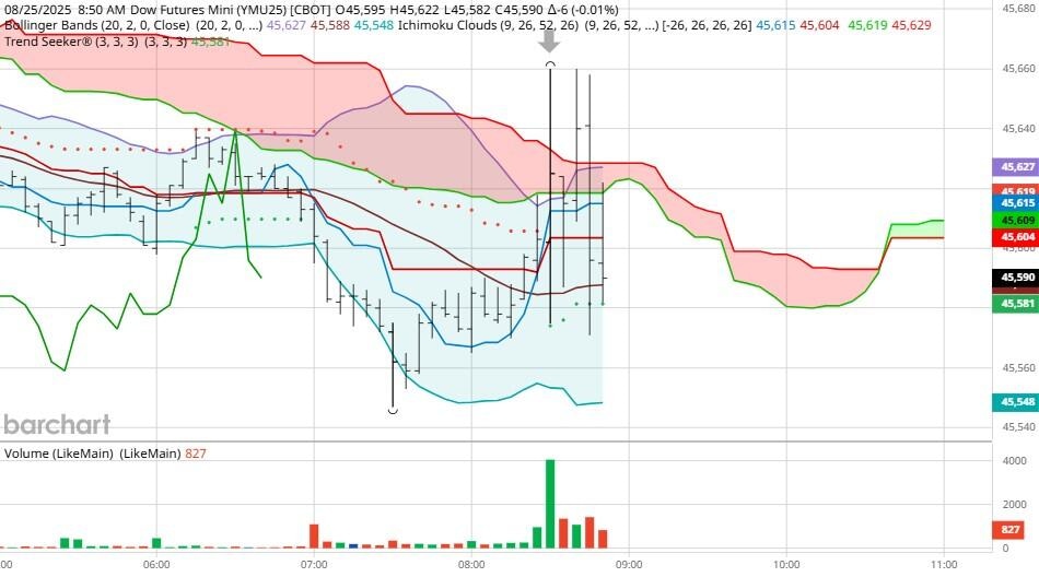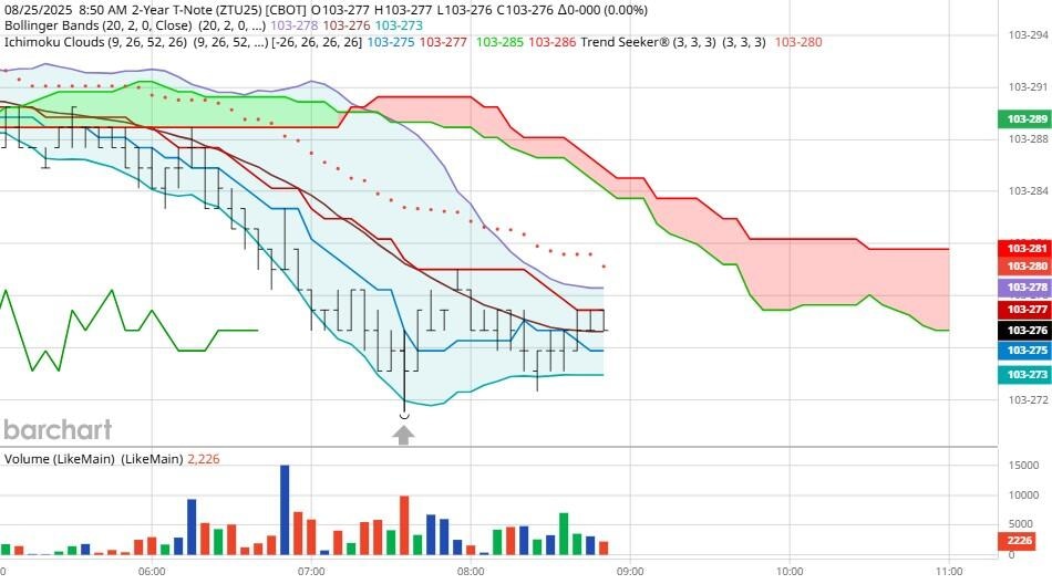 Yesterday the ZT climbed Higher at around 8:30 AM EST with no news pending. The Dow dived Lower at the same time. Look at the charts below and you'll see a pattern for both assets. The Dow dived Lower at around 8:30 AM EST and the ZT climbed Higher at around the same time. These charts represent the newest version of Bar Charts, and I've changed the timeframe to a 15-minute chart to display better. This represented a Long opportunity on the 2-year note, as a trader you could have netted about a dozen ticks per contract on this trade. Each tick is worth $6.25. Please note: the front month for ZT is now Sep '25 and the Dow is now Sep '25. I've changed the format to filled Candlesticks (not hollow) such that it may be more apparent and visible.