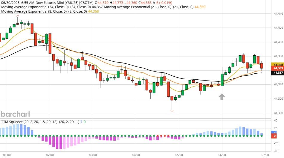 Yesterday the ZT dived Lower at around 7 AM EST with no pending news. The Dow climbed Higher at the same time. Look at the charts below and you'll see a pattern for both assets. The Dow climbed Higher at 7 AM EST and the ZT dived Lower at around the same time. These charts represent the newest version of Bar Charts, and I've changed the timeframe to a 15-minute chart to display better. This represented a Short opportunity on the 2-year note, as a trader you could have netted about 20 plus ticks per contract on this trade. Each tick is worth $6.25. Please note: the front month for ZT is now Sep '25 and the Dow is now Sep '25. I've changed the format to filled Candlesticks (not hollow) such that it may be more apparent and visible.