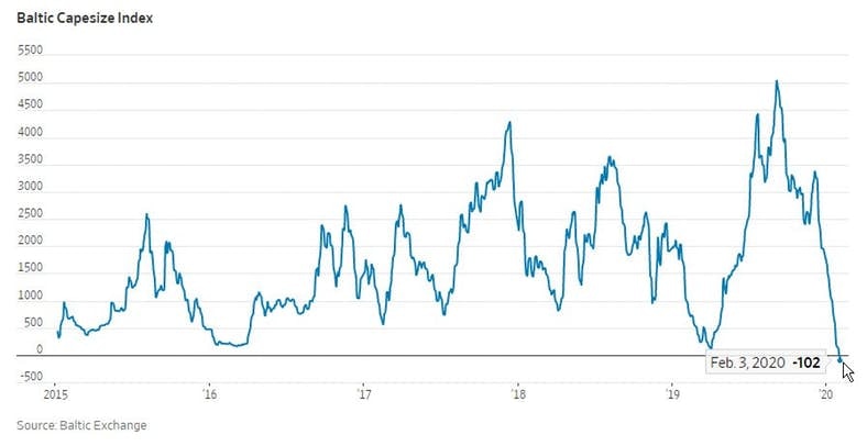 Index tracking freight rates for world’s largest cargo ships plunges deep into negative territory as coronavirus slows global trade.