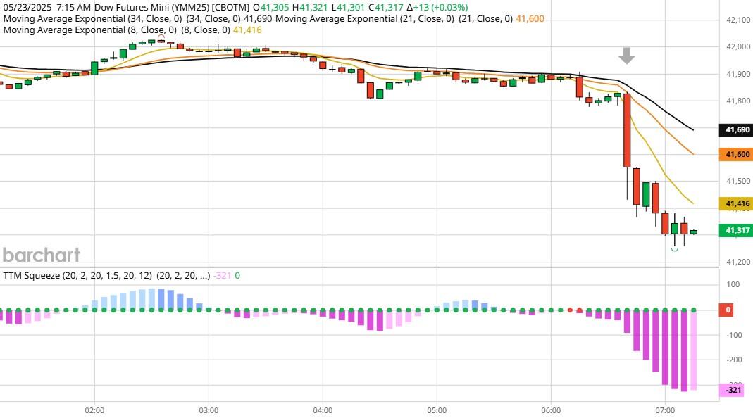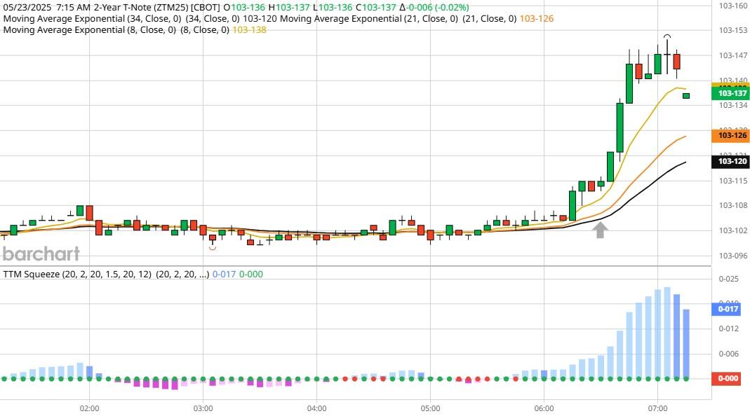 On Friday the ZT climbed Higher at around 7:30 AM EST with no news pending. The Dow dived Lower at the same time. Look at the charts below and you'll see a pattern for both assets. The Dow moved Lower at 7:30 AM EST and the ZT climbed Higher at around the same time. These charts represent the newest version of Bar Charts, and I've changed the timeframe to a 15-minute chart to display better. This represented a Long opportunity on the 2-year note, as a trader you could have netted 30 plus ticks per contract on this trade. Each tick is worth $6.25. Please note: the front month for ZT is now Jun '25 and the Dow is Jun '25 as well. I've changed the format to filled Candlesticks (not hollow) such that it may be more apparent and visible.