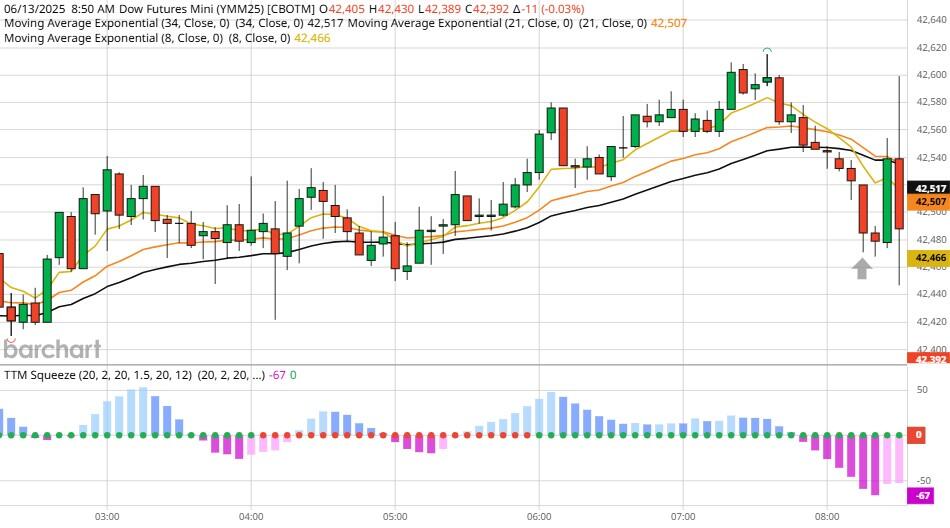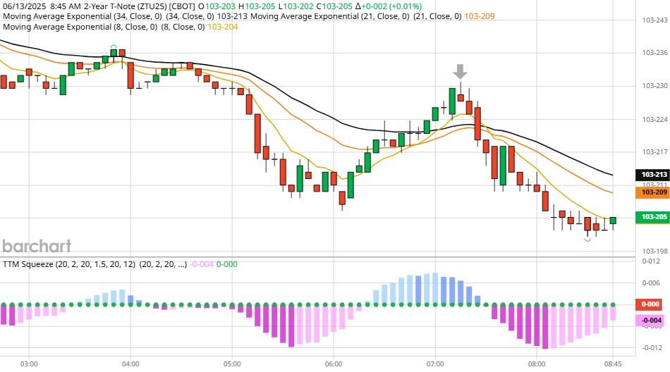 On Friday the ZT dived Lower at around 8:30 AM EST with no news pending. The Dow er at the same time. Look at the charts below and you'll see a pattern for both assets. The Dow climbed Higher at 8:30 AM EST and the ZT dived Lower at around the same time. These charts represent the newest version of Bar Charts, and I've changed the timeframe to a 15-minute chart to display better. This represented a Short opportunity on the 2-year note, as a trader you could have netted 30 plus ticks per contract on this trade. Each tick is worth $6.25. Please note: the front month for ZT is now Sep '25 and the Dow is still Jun '25. I've changed the format to filled Candlesticks (not hollow) such that it may be more apparent and visible.