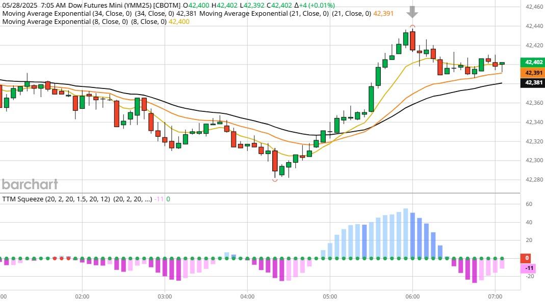Yesterday the ZT climbed Higher at around 7:30 AM EST with no real news to speak of. The Dow dived Lower at the same time. Look at the charts below and you'll see a pattern for both assets. The Dow moved Lower at 7:30 AM EST and the ZT climbed Higher at around the same time. These charts represent the newest version of Bar Charts, and I've changed the timeframe to a 15-minute chart to display better. This represented a Long opportunity on the 2-year note, as a trader you could have netted a dozen plus ticks per contract on this trade. Each tick is worth $6.25. Please note: the front month for ZT is now Jun '25 and the Dow is Jun '25 as well. I've changed the format to filled Candlesticks (not hollow) such that it may be more apparent and visible.