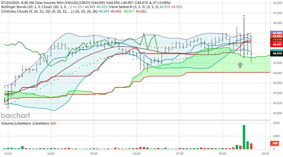 Yesterday the ZT dived Lower at around 8:30 AM EST with no economic reports pending. The Dow climbed Higher at the same time. Look at the charts below and you'll see a pattern for both assets. The Dow climbed Higher at 8:30 AM EST and the ZT dived Lower at around the same time. These charts represent the newest version of Bar Charts, and I've changed the timeframe to a 15-minute chart to display better. This represented a Short opportunity on the 2-year note, as a trader you could have netted about a dozen plus ticks per contract on this trade. Each tick is worth $6.25. Please note: the front month for ZT is now Sep '25 and the Dow is now Sep '25. I've changed the format to filled Candlesticks (not hollow) such that it may be more apparent and visible.