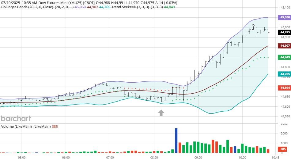Yesterday the ZT dived Lower at around 8 AM EST with Unemployment Claims pending. The Dow leapt Higher at the same time. Look at the charts below and you'll see a pattern for both assets. The Dow dived Lower at 8:30 AM EST and the ZT climbed Higher at around the same time. These charts represent the newest version of Bar Charts, and I've changed the timeframe to a 15-minute chart to display better. This represented a Short opportunity on the 2-year note, as a trader you could have netted about a 20 plus ticks per contract on this trade. Each tick is worth $6.25. Please note: the front month for ZT is now Sep '25 and the Dow is now Sep '25. I've changed the format to filled Candlesticks (not hollow) such that it may be more apparent and visible.
