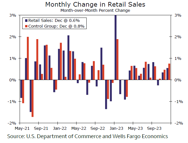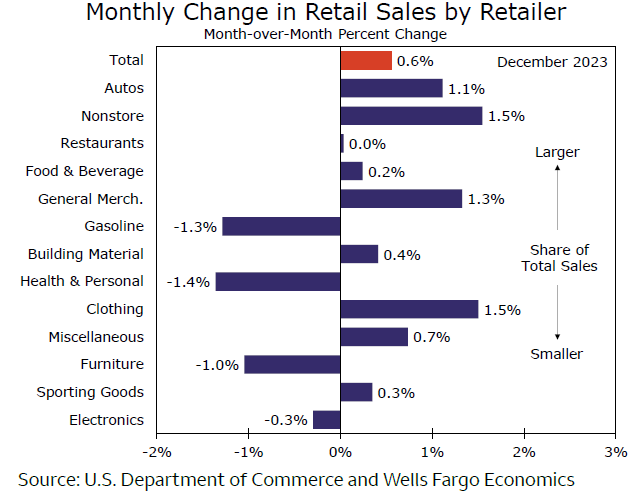 For anyone thinking that the consumer was losing momentum at the end of last year, think again. Retail sales rose 0.6% in December, handily exceeding expectations. Auto sales were expected to be a key driver, and that category was indeed up 1.1% in the month, but the strength extended beyond motor vehicle sales (chart).