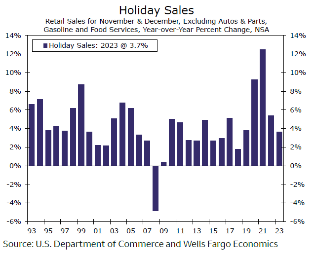 Overall our measure of holiday sales, which includes total retail sales less sales at auto dealers, gasoline stations and restaurants, rose 0.7% in December (10.5% on a non-seasonally adjusted basis). Holiday sales were thus up nearly 4% over last year, which is slightly below our initial estimate for a 5% annual gain. As seen in the nearby chart, this puts the 2023 holiday sales season essentially in line with the pre-pandemic average.