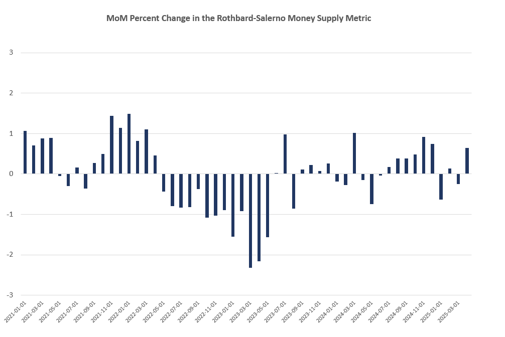 Based on the “true,” or Rothbard-Salerno, money supply measure (TMS), the money supply expanded by 2.2 percent year-over-year in April. That was up from a 1.4 percent increase in March.