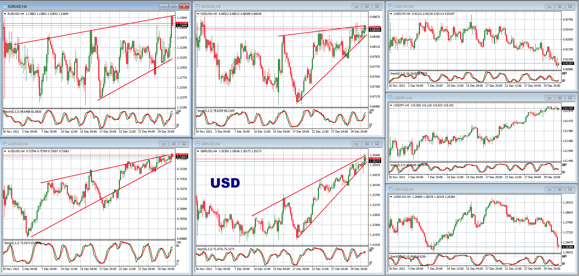 The charts also show multi-week rising wedges forming on EURUSD, NZDUSD, AUDUSD and GBPUSD, so we might be looking at technical reversals going into January.
