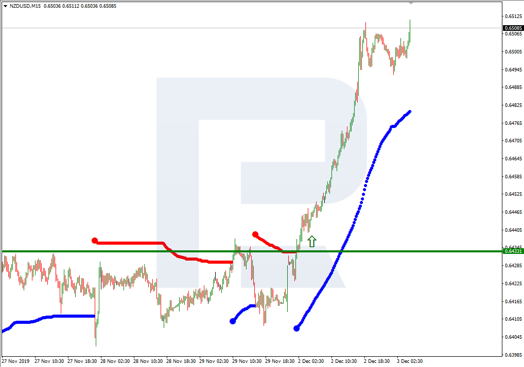 As we can see in the M15 chart, the pair has broken the upside line of the VoltyChannel indicator and, as a result, continue moving upwards.