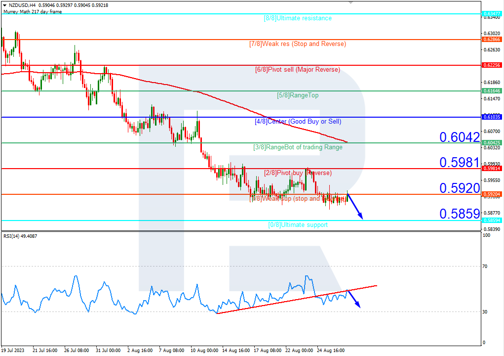On the NZDUSD chart, the situation is similar. The quotes are under the 200-day Moving Average on H4, indicating the prevalence of a downtrend, and the RSI is testing the resistance level. In this situation, a rebound from 1/8 (0.5920) is expected, followed by a decline to the support at 0/8 (0.5859). The scenario can be cancelled by rising above the resistance at 1/8 (0.5920). In this case, the pair could rise to 2/8 (0.5981).