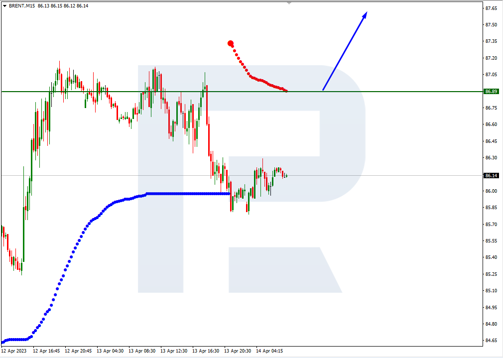 On H4, the quotes are above the 200-day Moving Average, which indicates the prevalence of an uptrend. The RSI is testing the support line. In this situation, the quotes are expected to rise above 4/8 (87.50) and reach the resistance at 5/8 (90.62). The scenario can be canceled by a downward breakout of 3/8 (84.38), which could make the quotes drop to the support at 2/8 (81.25).
